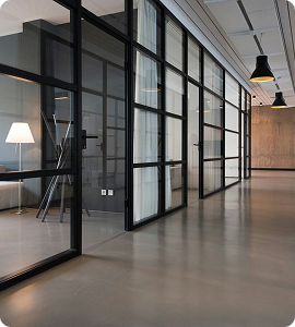 - Двери и перегородки: Применяются для зонирования пространства с современным дизайном. Монтаж алюминиевых конструкций выполняется с учетом требований безопасности и эстетики.